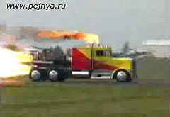 Грузовик мощьностью 35 тысяч лошадиных сил соревнуется по скорости с самолётом.